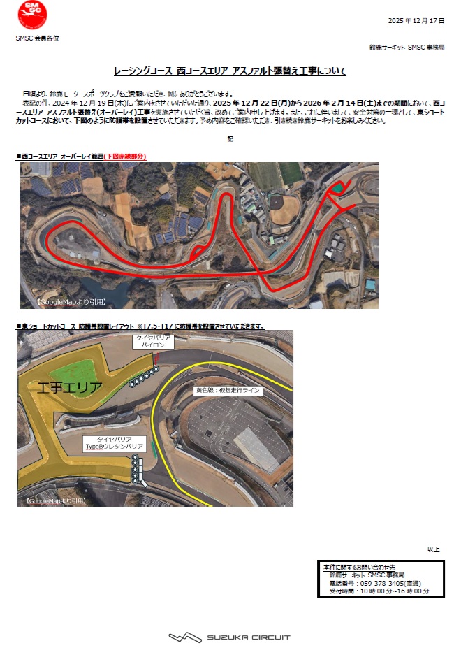 鈴鹿サーキットは2026年2月14日(土)まで西コースエリアのアスファルト張替工事が行われています。